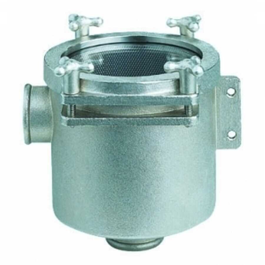Deniz suyu filtresi. Gövdesi pirinç üzeri nikelaj, filtre elemanı ve diğer aksam paslanmaz çeliktir. RINA onaylıdır.
