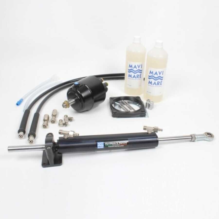 GM2-MRA01 pump + CE50 cylinder + chrome plated brass fittings (1 kit GTN7X10916ORB + 1 Kit AC38/T916) + fast connection filler tube kit + 2 lt. hydraulic oil + 2 x 7,5 mt. SAE100 R7 5/16 hose.